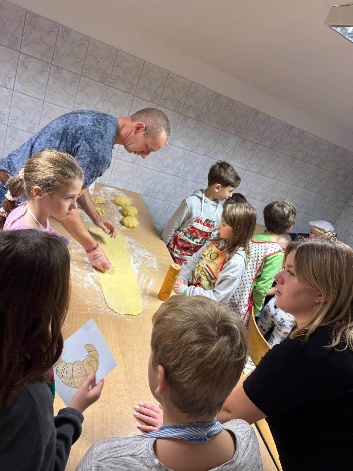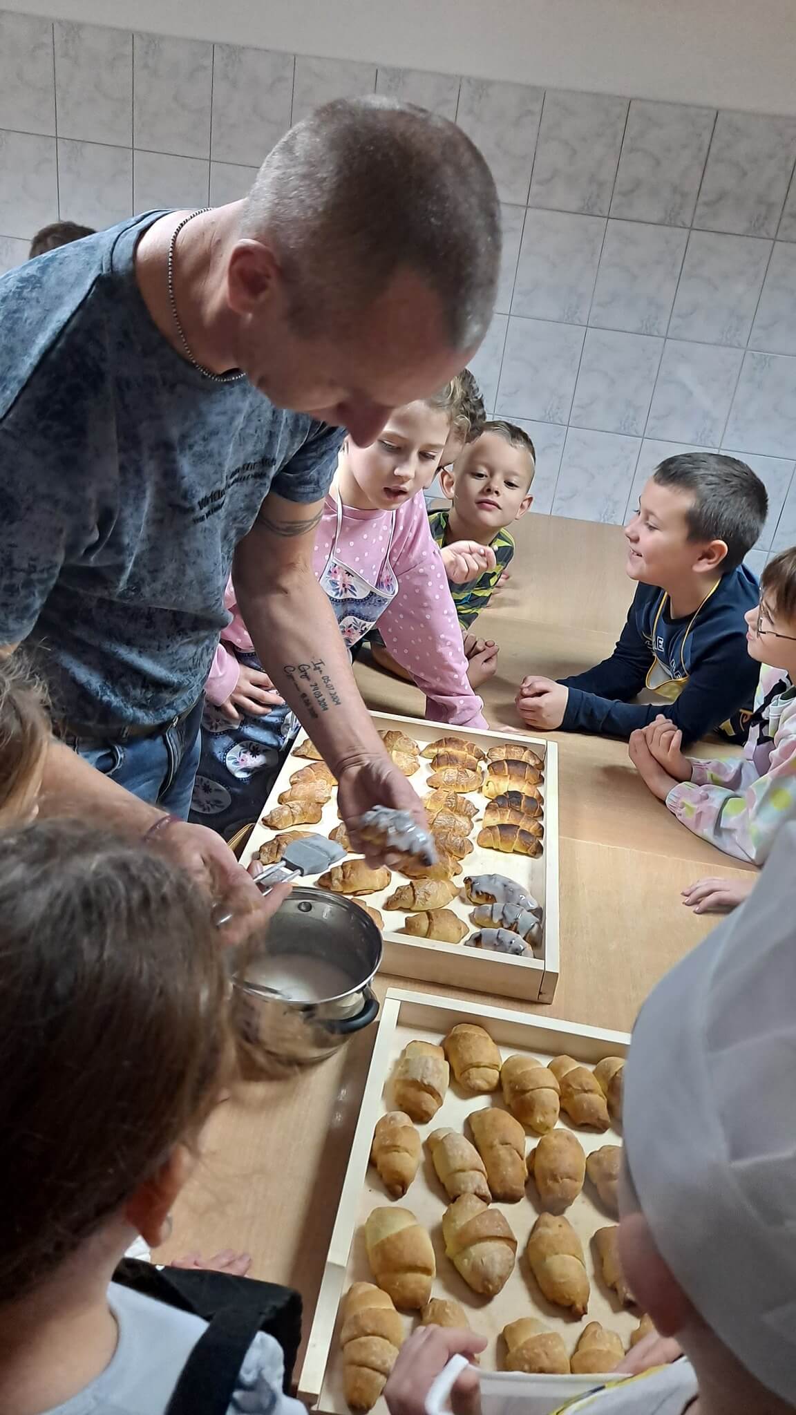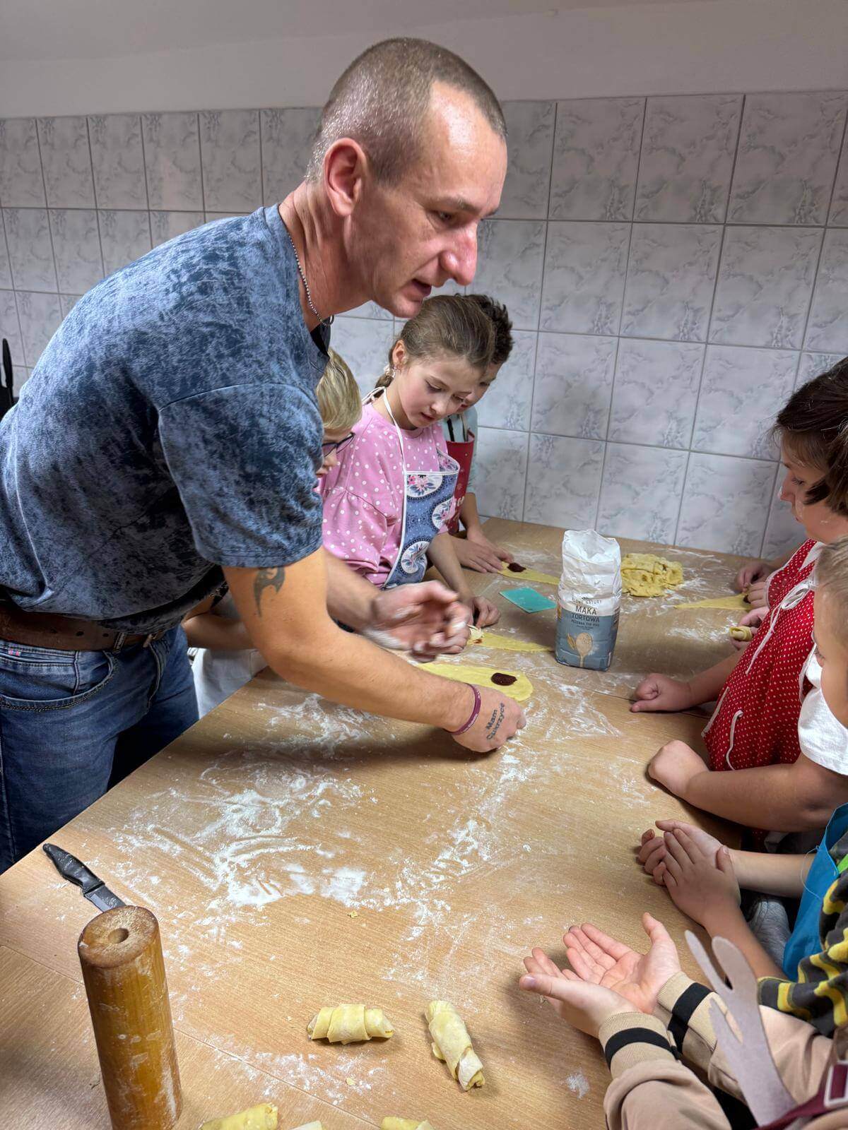 Następnie warsztaty poprowadził tata Cypriana, który przygotował całe ciasto, pokazał dzieciom, jakie składniki są potrzebne, oraz krok po kroku wyjaśnił, jak je wyrobić, aby powstały idealne rogale. Potem wspólnie zawijaliśmy rogaliki, lukrowaliśmy i oczywiście… z wielkim apetytem zajadaliśmy.