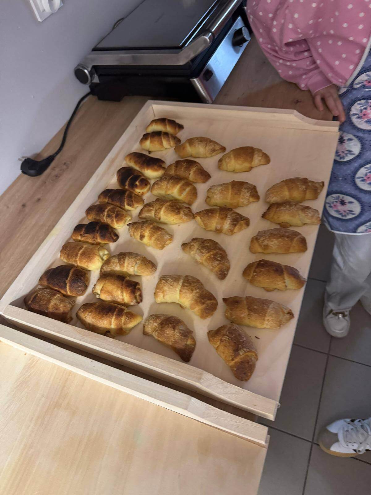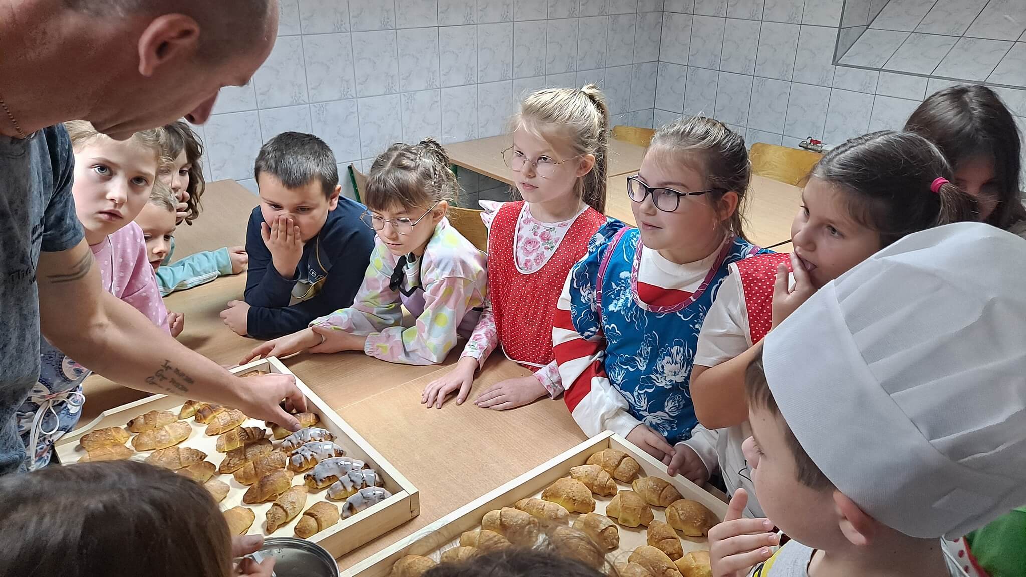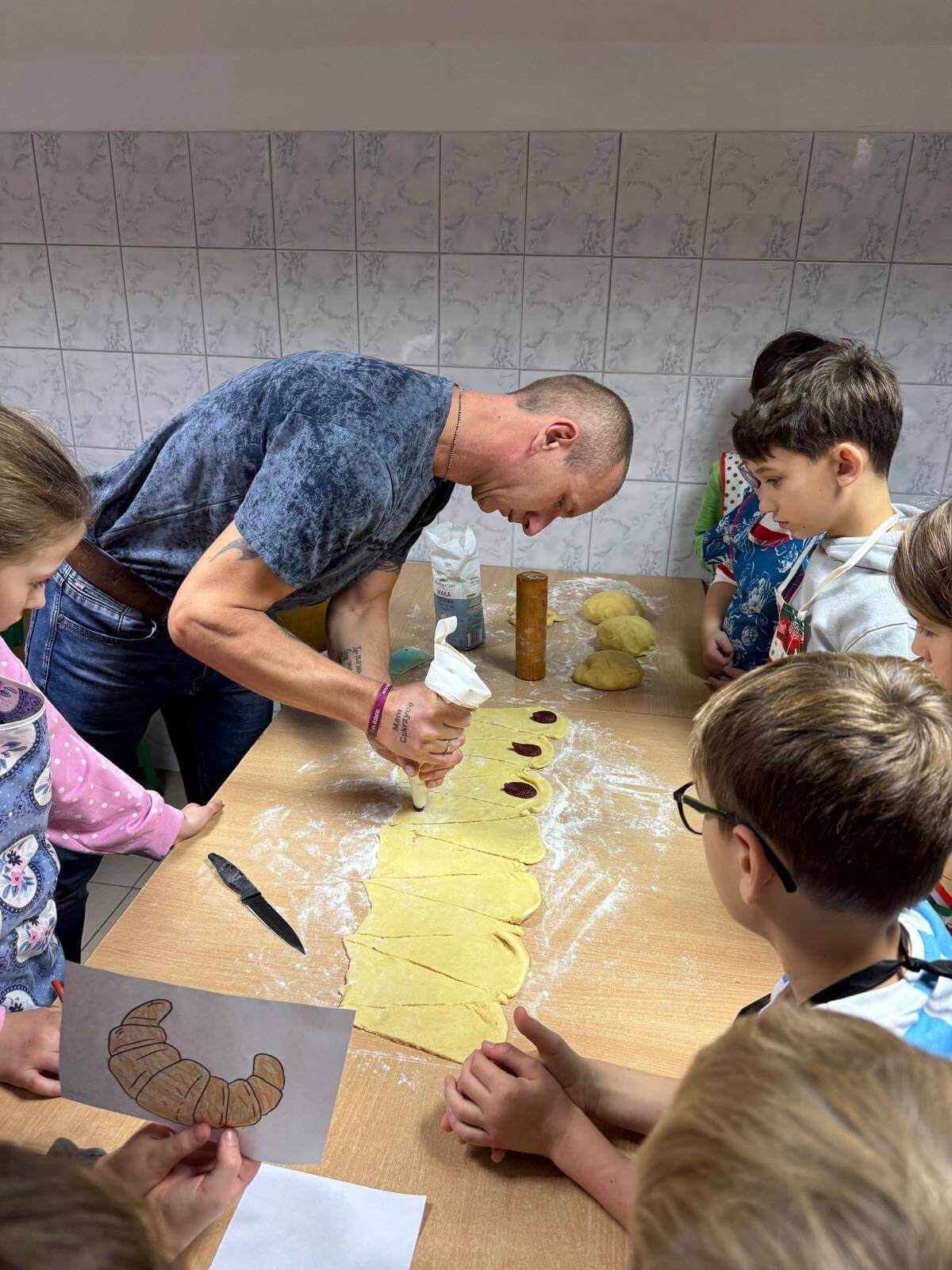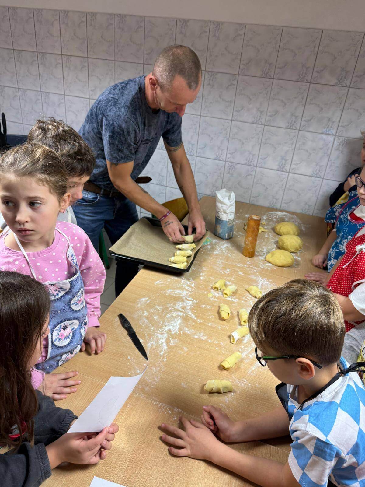 Następnie warsztaty poprowadził tata Cypriana, który przygotował całe ciasto, pokazał dzieciom, jakie składniki są potrzebne, oraz krok po kroku wyjaśnił, jak je wyrobić, aby powstały idealne rogale. Potem wspólnie zawijaliśmy rogaliki, lukrowaliśmy i oczywiście… z wielkim apetytem zajadaliśmy.