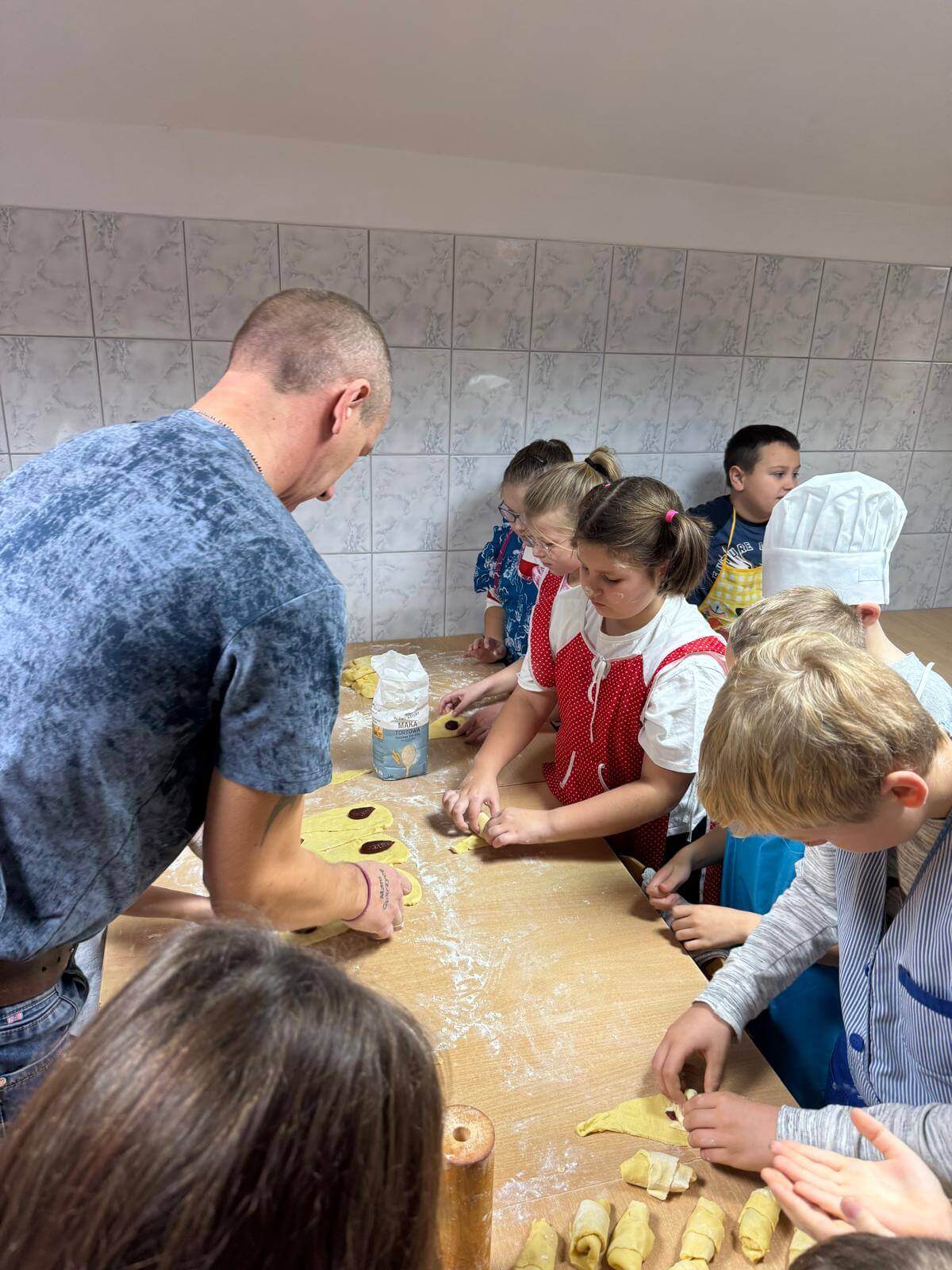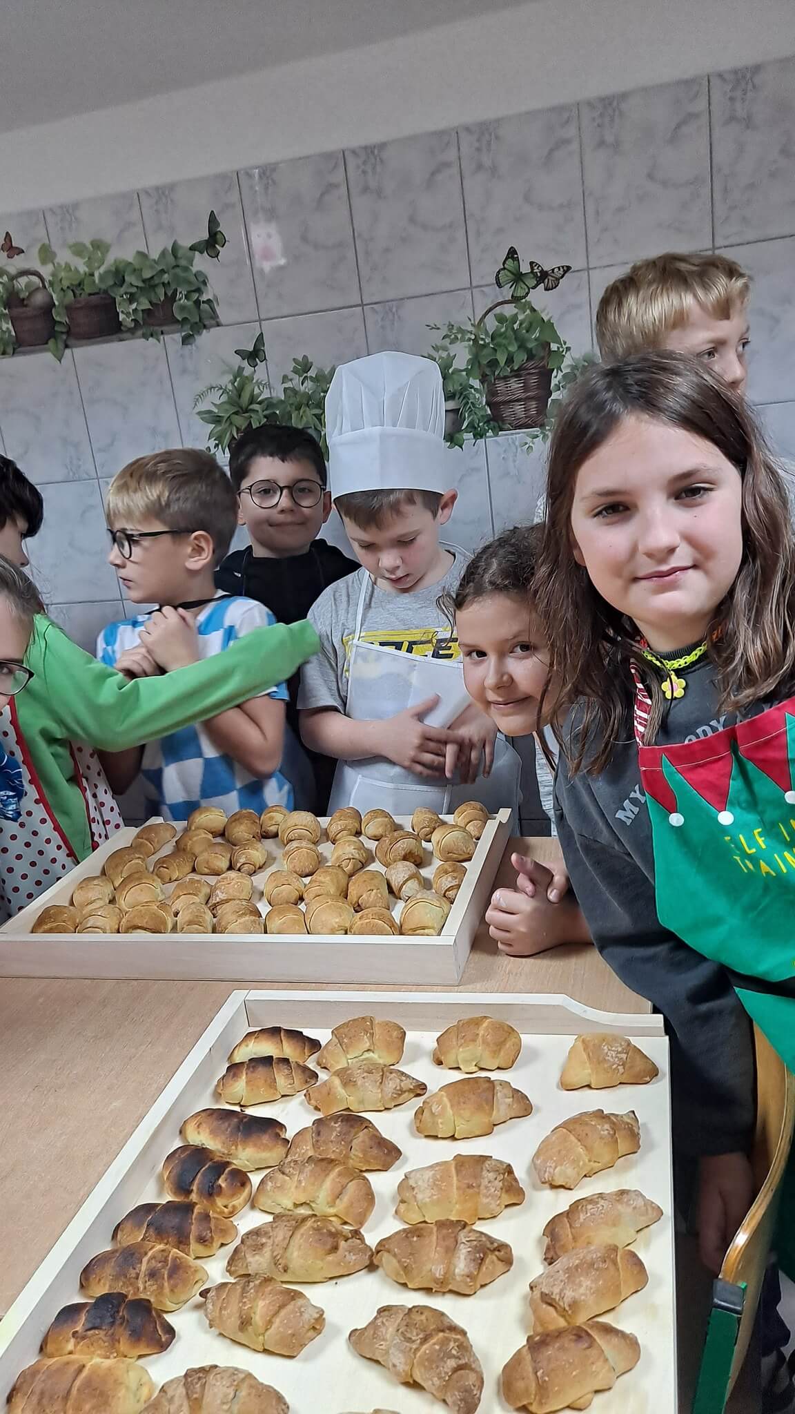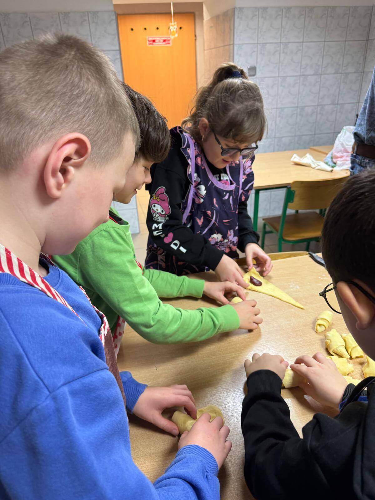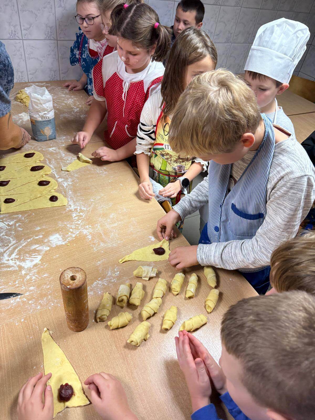14 listopada 2025 r. w szkolnej stołówce uczniowie klasy II b wzięli udział w wyjątkowych warsztatach pieczenia rogalików. Było radośnie, gwarno i bardzo pysznie!