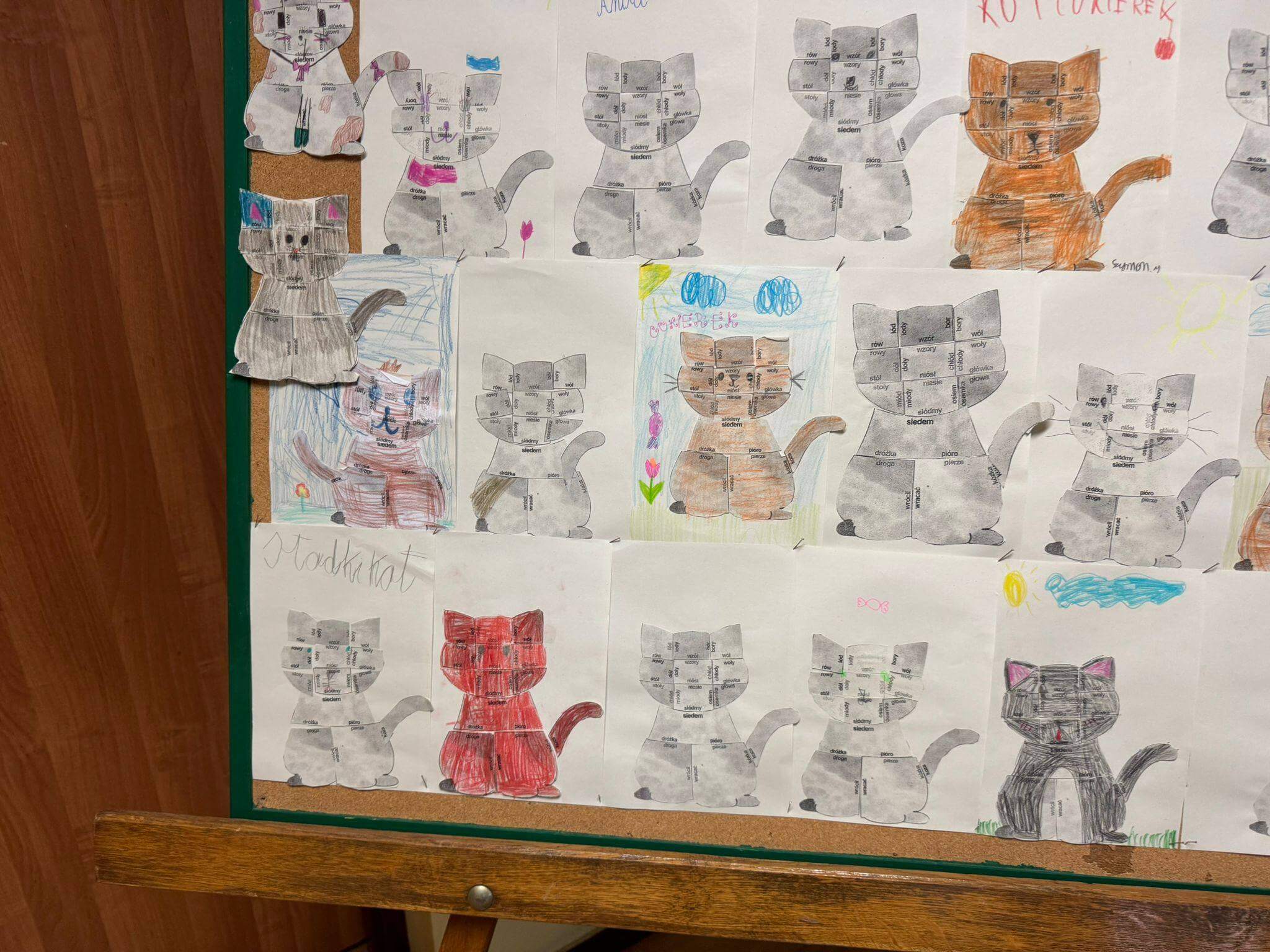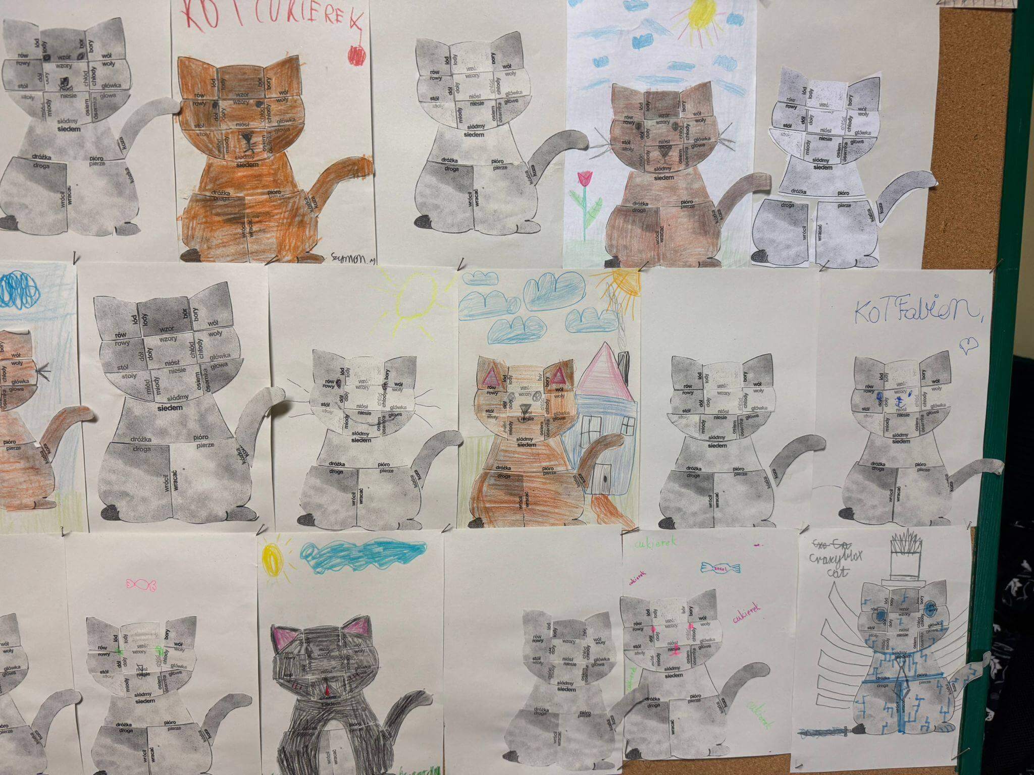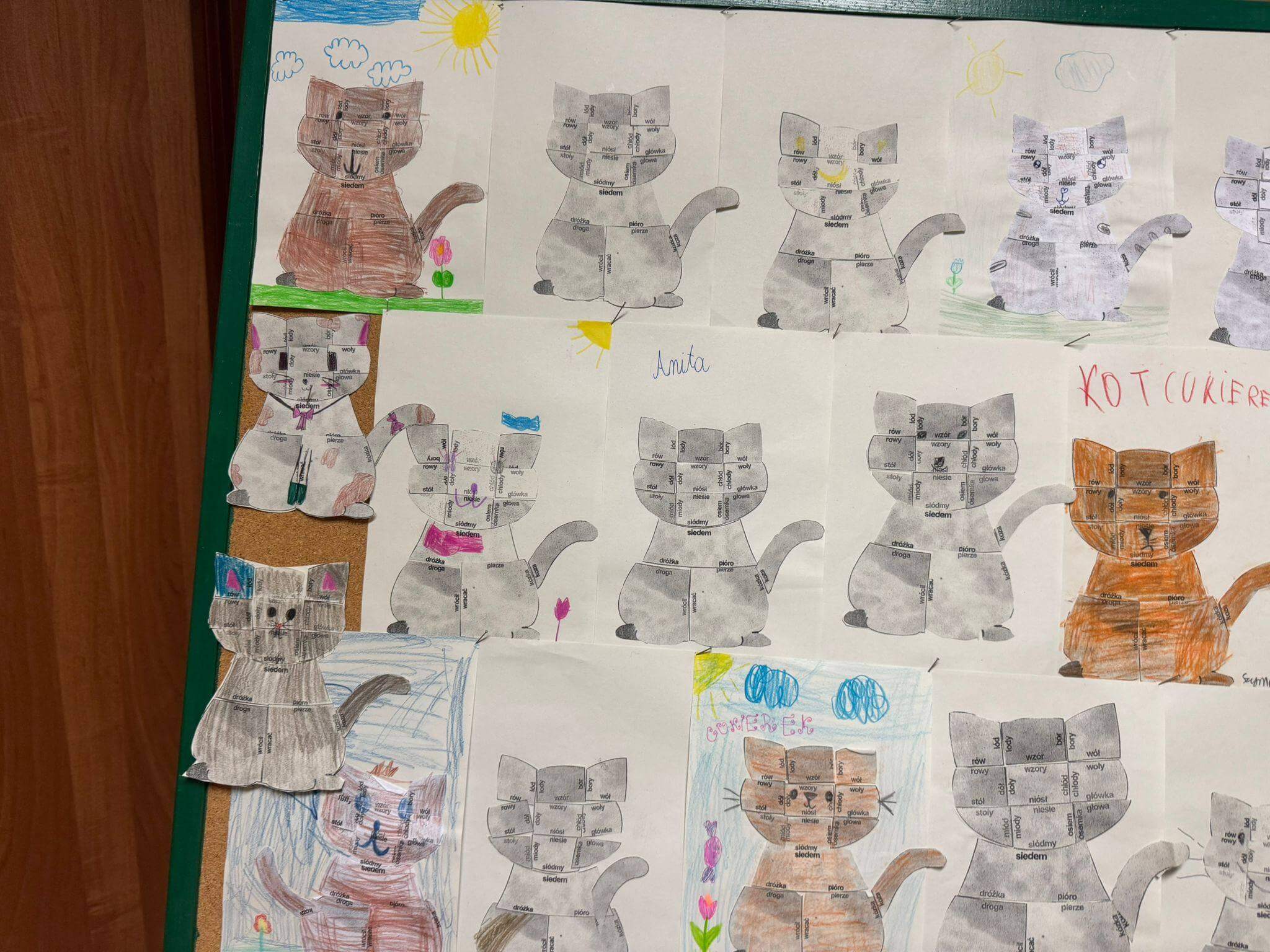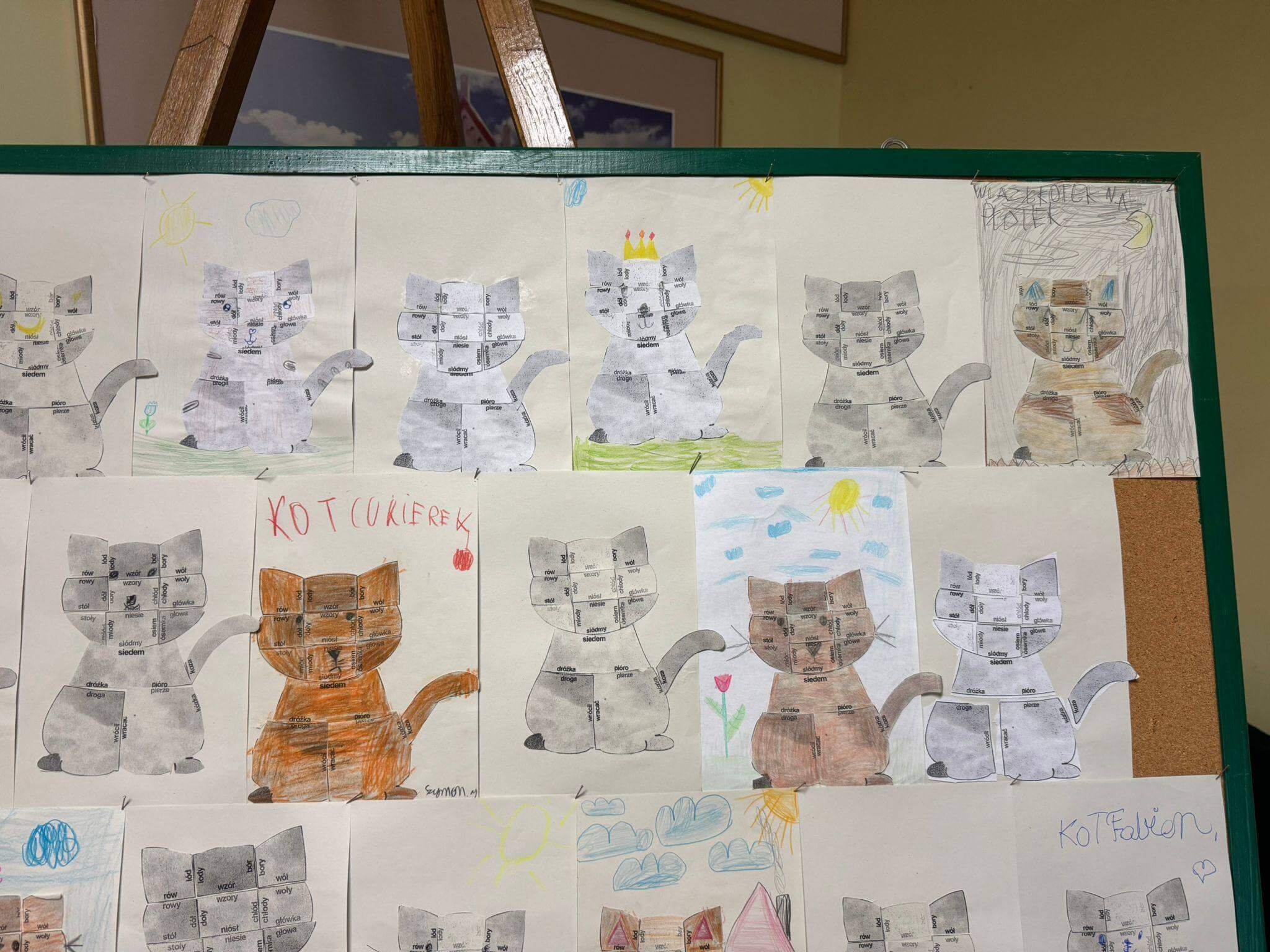 Efektem pracy były oryginalne prace plastyczne przedstawiające koty, które w twórczy sposób łączyły elementy zabawy z ćwiczeniami logopedycznymi 🐱🎨. Zajęcia nie tylko rozwijały umiejętności językowe, ale także budowały wrażliwość, wyobraźnię i radość z aktywnego uczestnictwa w kulturze czytelniczej 🌟📖.
