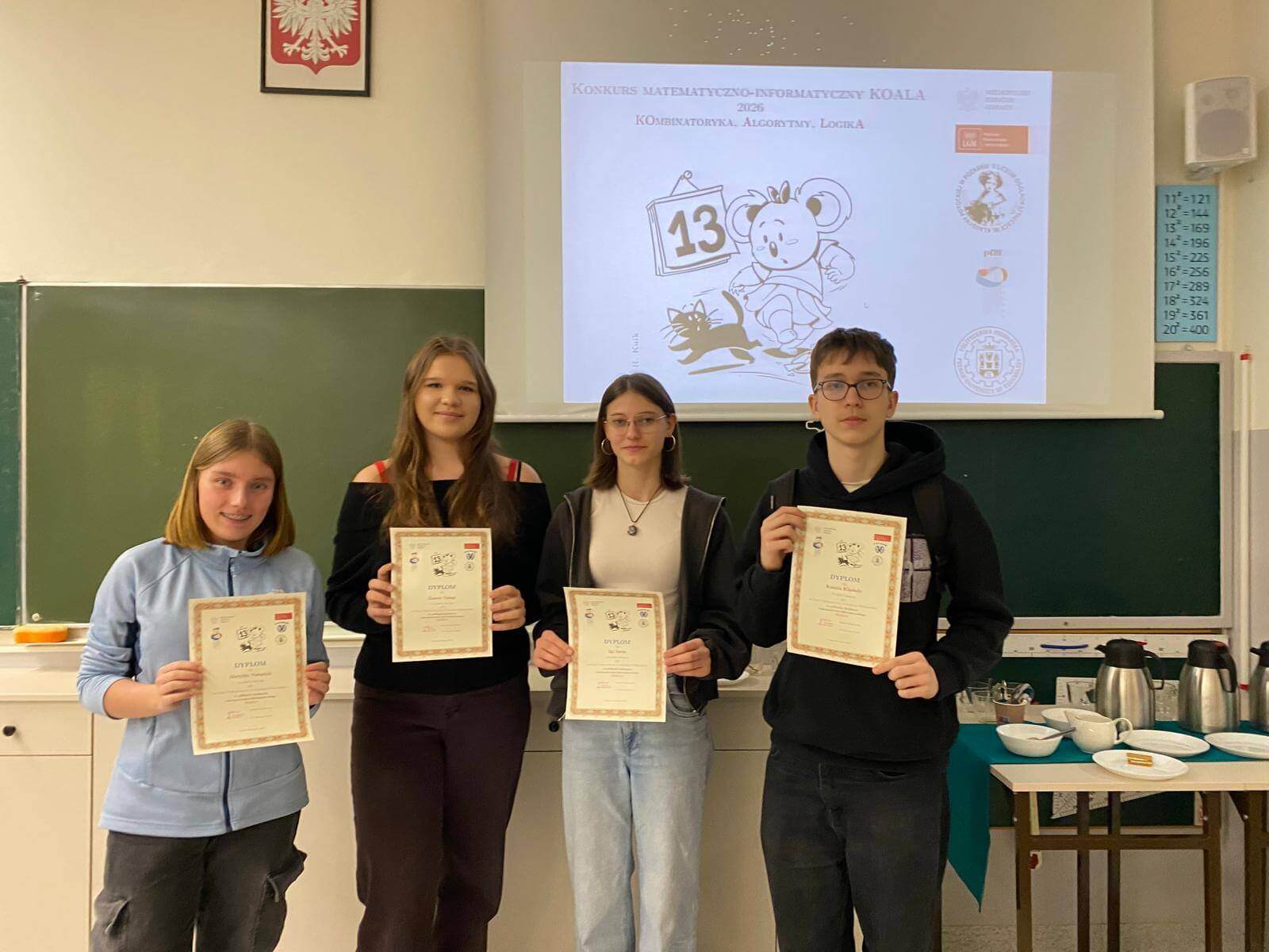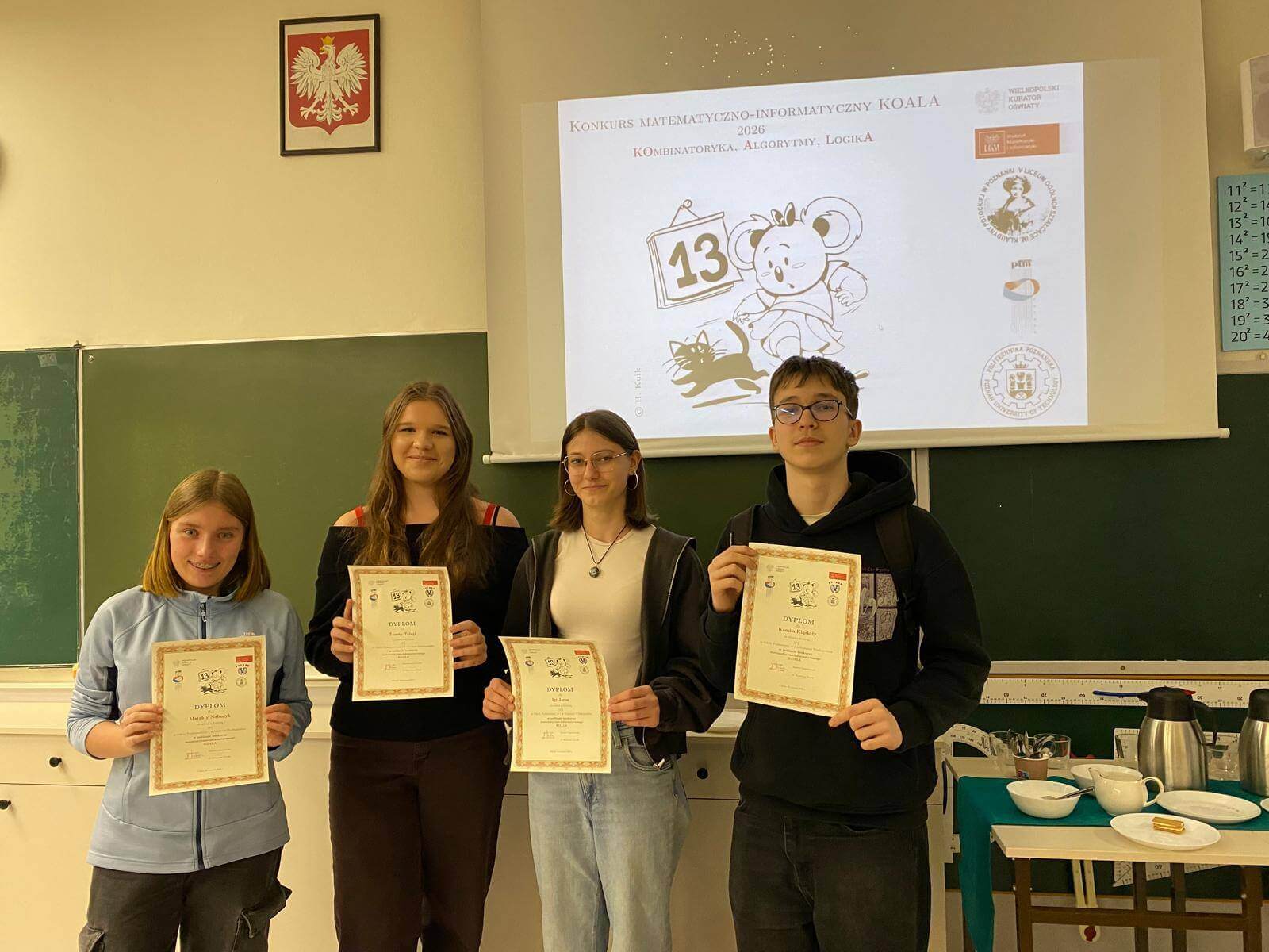 Z dumą informujemy, że drużyna naszej szkoły w składzie: Iga Jarus, Kamil Kląskała, Matylda Nabzdyk, Żaneta Talaga zakwalifikowała się do półfinałów konkursu matematyczno-informatycznego KOALA, które miały miejsce 30.01.2026 r. w V LO im. Klaudyny Potockiej w Poznaniu, znajdując się w gronie 11 najlepszych zespołów ze szkół podstawowych!