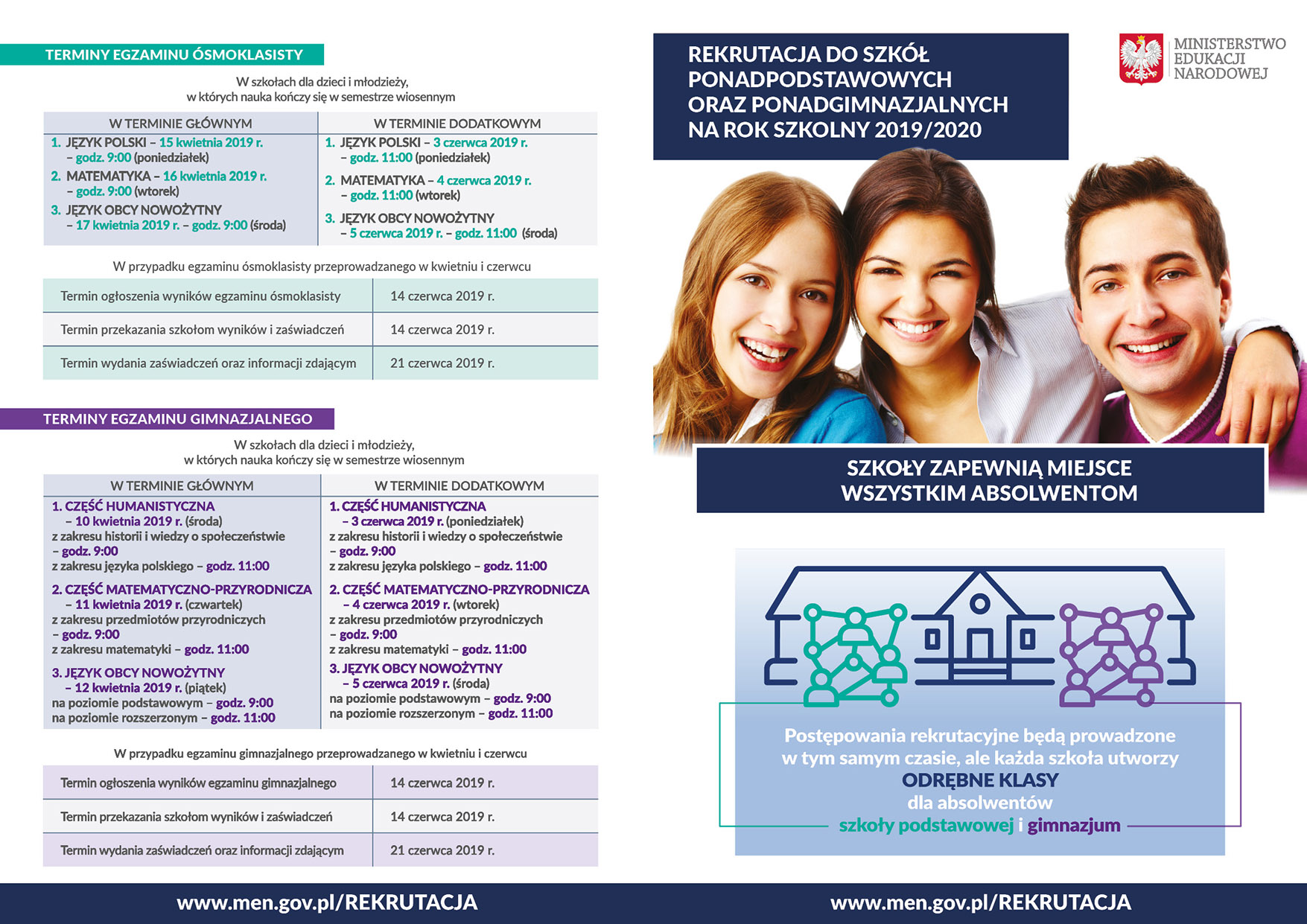 Zwracamy się z uprzejmą prośbą o przekazanie Rodzicom uczniów klas VIII szkoły podstawowej i III gimnazjum materiałów informacyjnych dotyczących rekrutacji do szkół ponadpodstawowych i ponadgimnazjalnych w roku szkolnym 2019/20 przygotowanych przez Ministerstwo Edukacji Narodowej. Znajdują się w nich zasady naboru do klas pierwszych. Naszym wspólnym celem jest upowszechnianie wiedzy na temat rekrutacji.