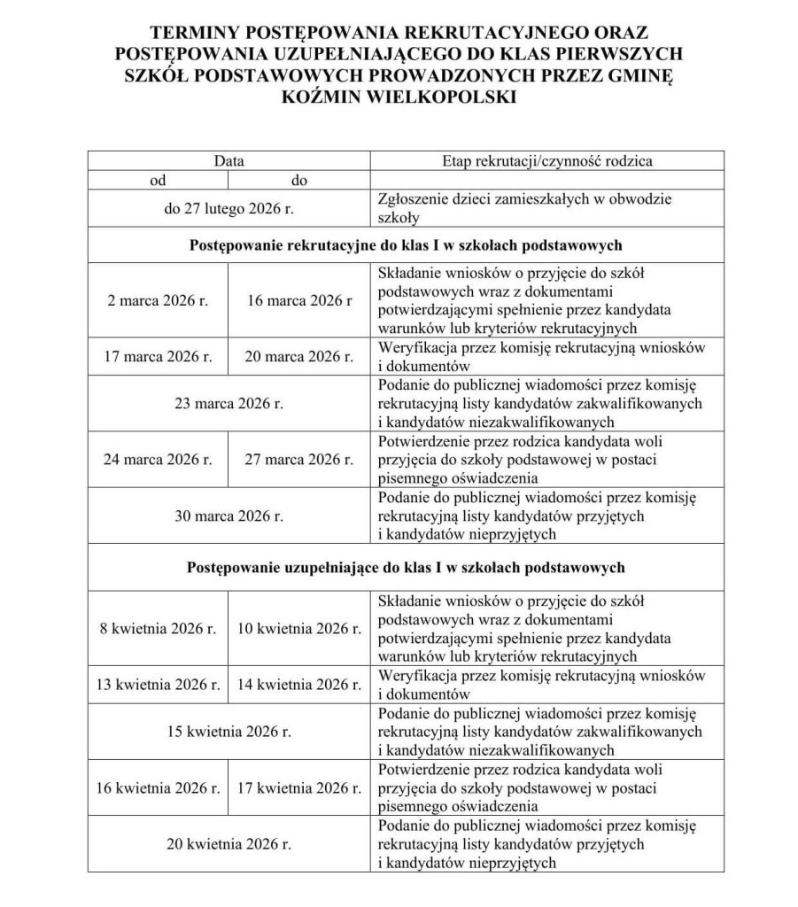 W dniu 3 lutego 2026 r. została powołana Komisja Rekrutacyjna do przeprowadzenia postępowania rekrutacyjnego do klas pierwszych Szkoły Podstawowej nr 1 im. Strajku Dzieci Koźmińskich 1906/1907 w Koźminie Wielkopolskim na rok szkolny 2026/2027.