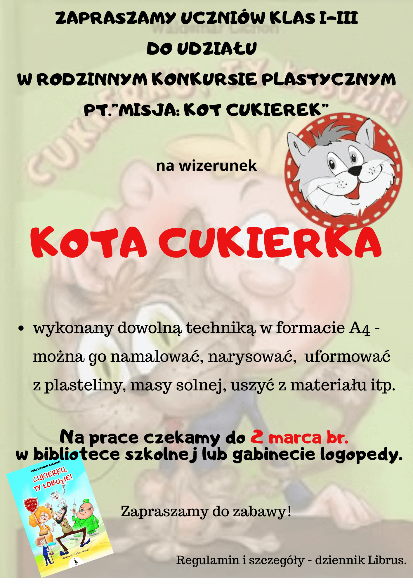 W ramach udziału w Ogólnopolskiej Akcji Czytelniczej „LUTY Z CUKIERKIEM. KSIĄŻKI Z PAZUREM”, z okazji Dnia Kota zapraszamy uczniów klas I-III do udziału w rodzinnym konkursie plastycznym „Misja: Kot Cukierek”. Stwórzcie razem wyjątkową pracę i przynieście ją do biblioteki szkolnej – lub gabinetu logopedy – niech kocia wyobraźnia działa pełną mocą! 📚🐾 🐾📚