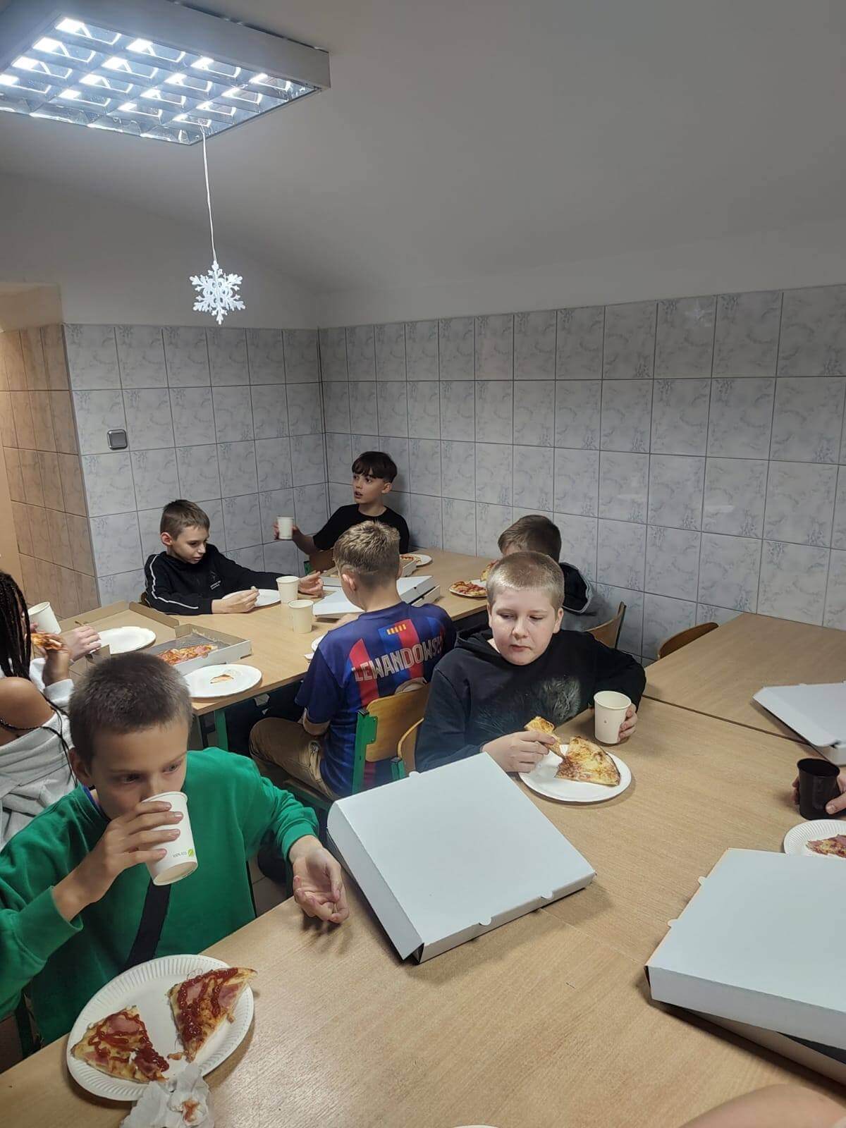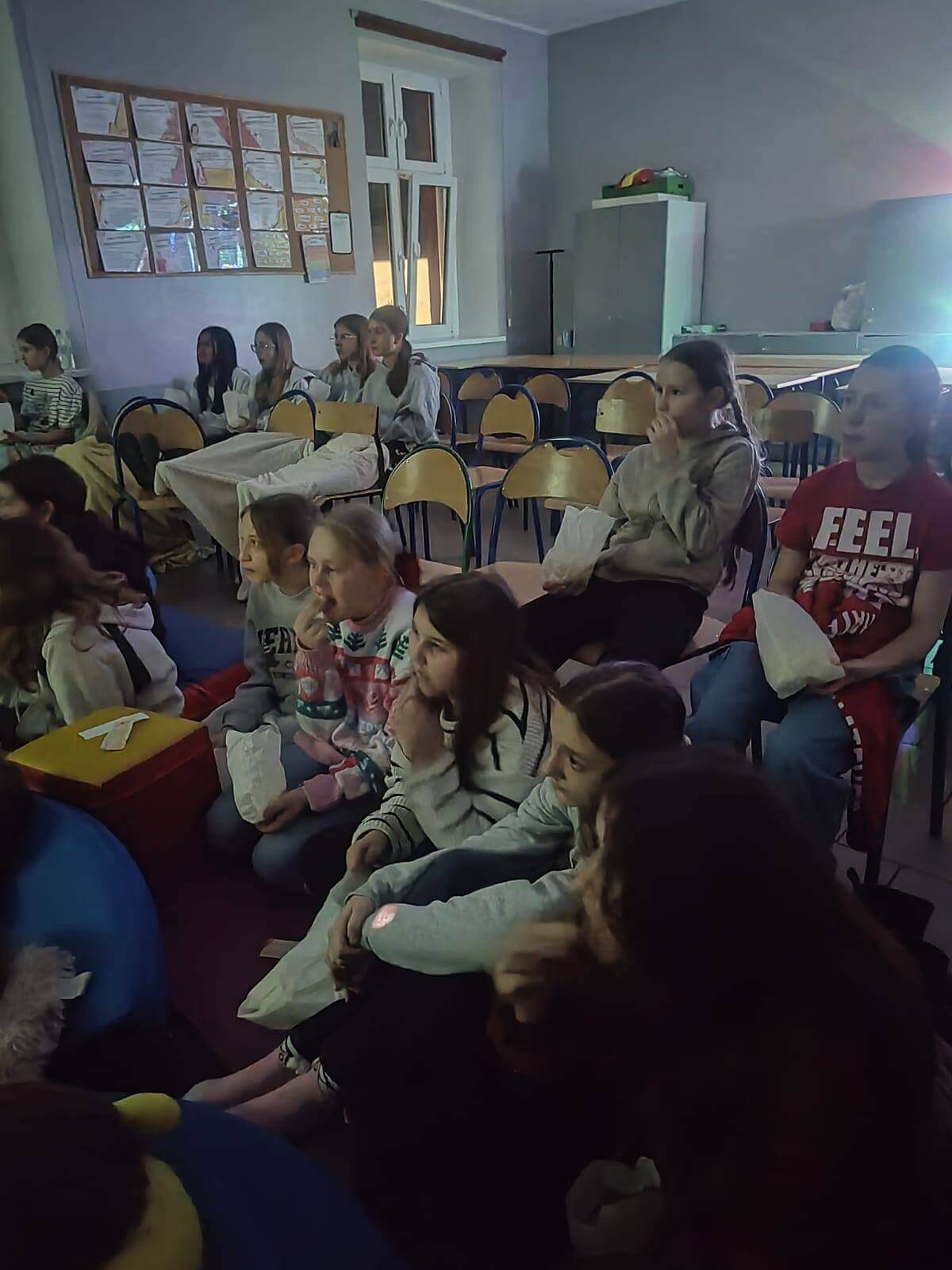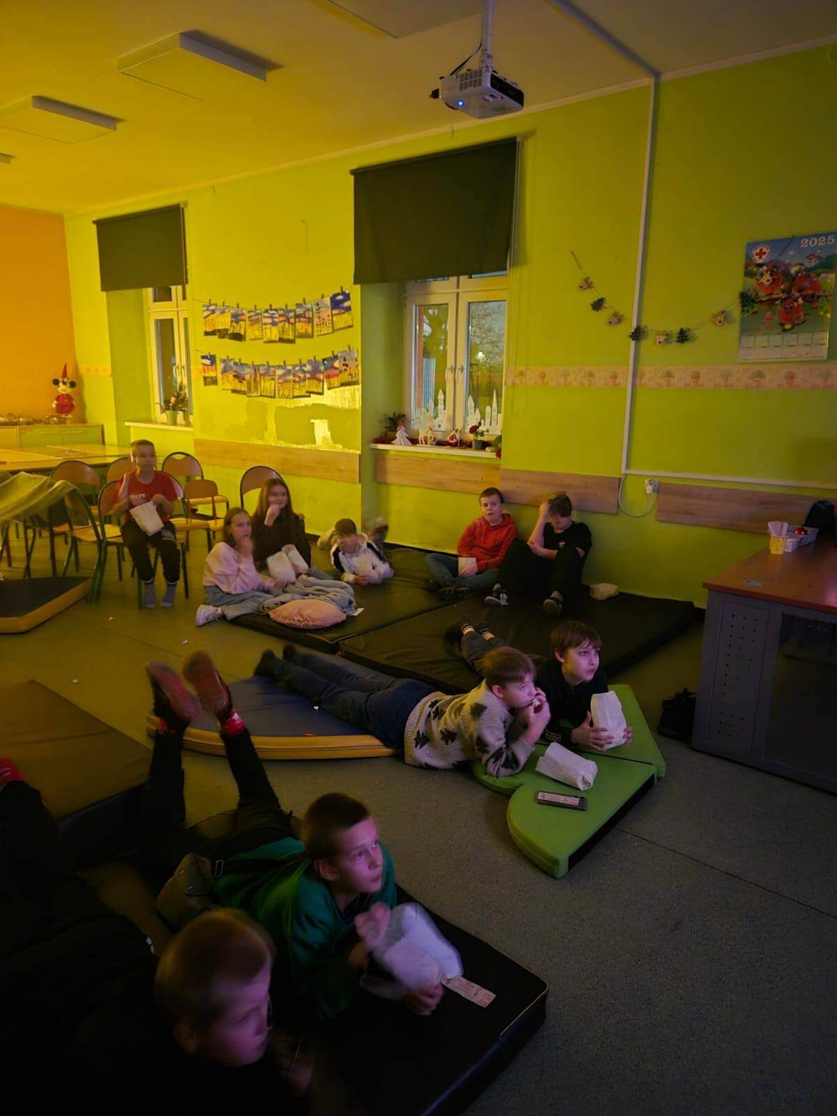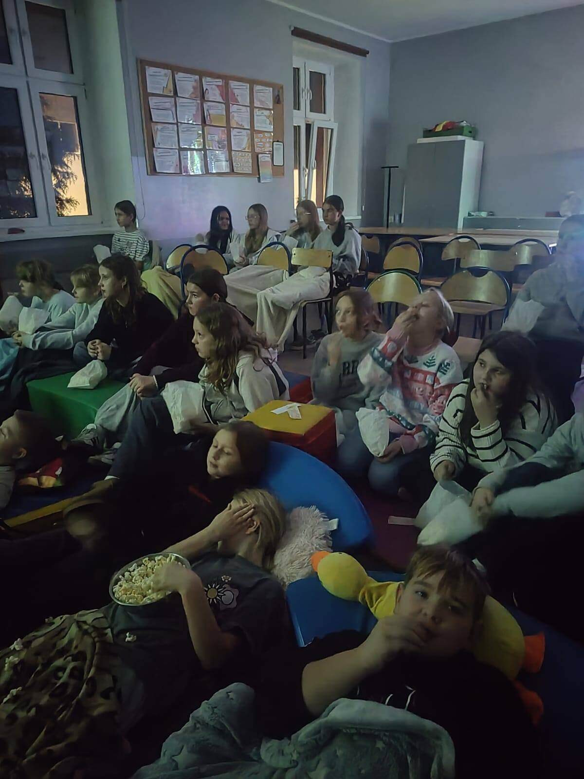 Nie zabrakło też przekąsek – dzieci zajadały popcorn, pizzę i wspólnie cieszyły się czasem spędzonym razem. Po seansach czekała na nich jeszcze druga część atrakcji – gry planszowe, które dostarczyły dużo śmiechu i dobrej zabawy.