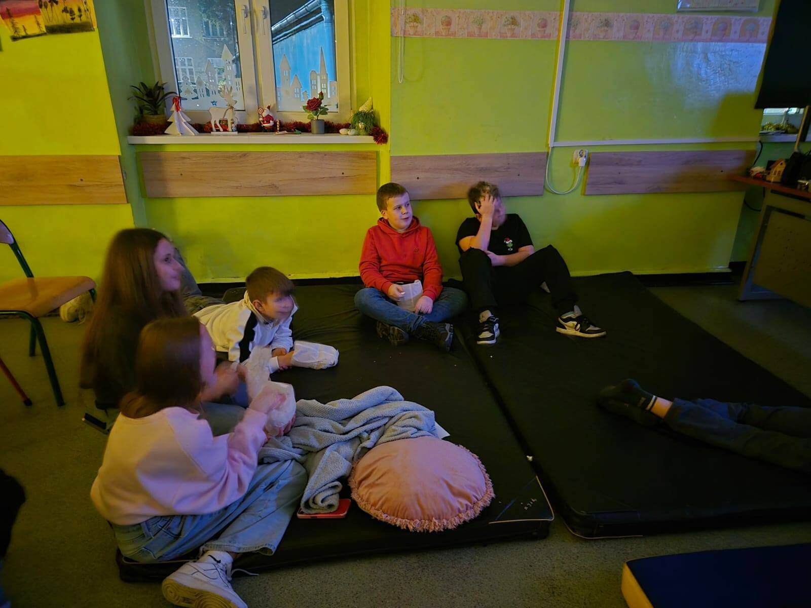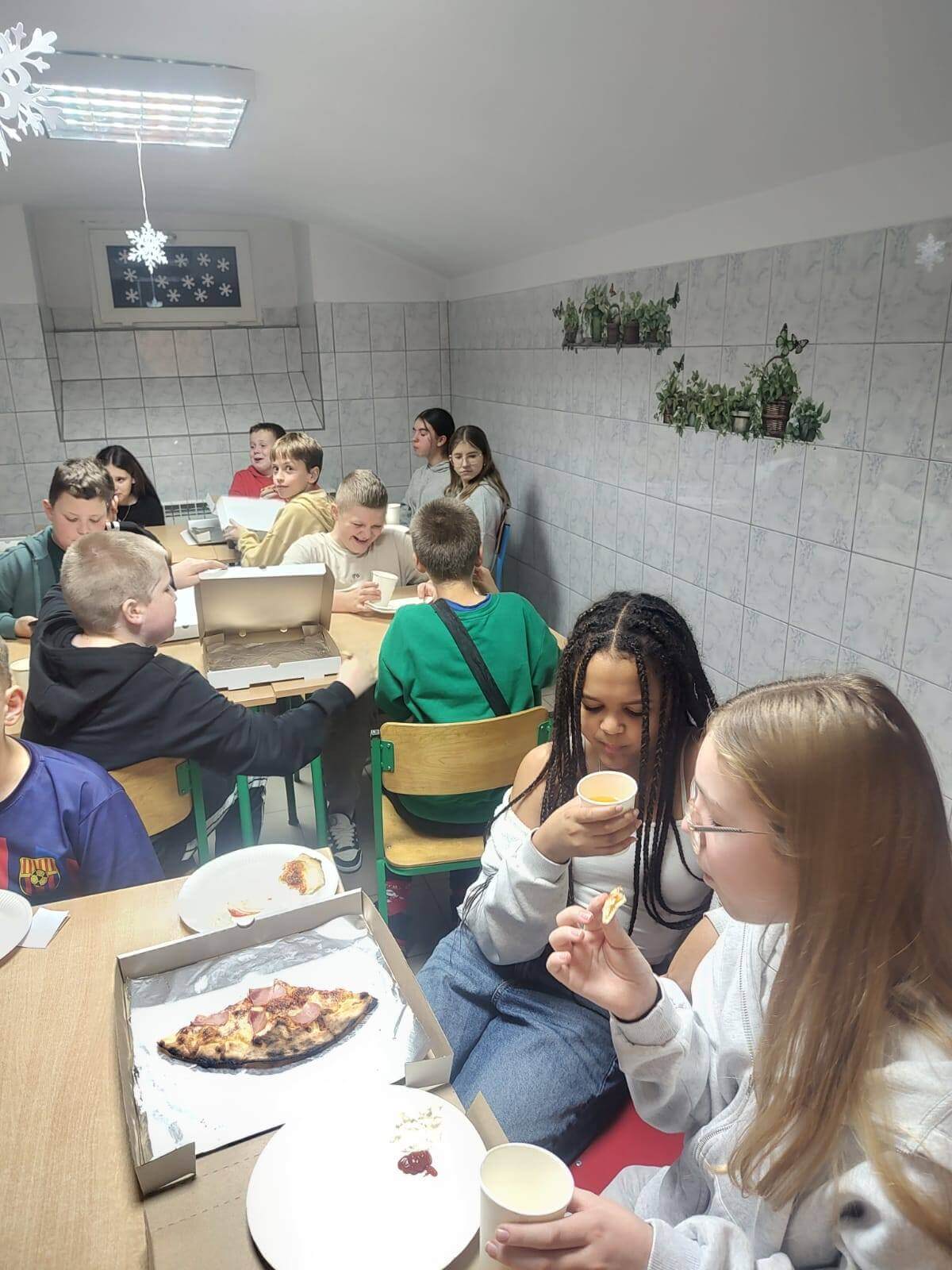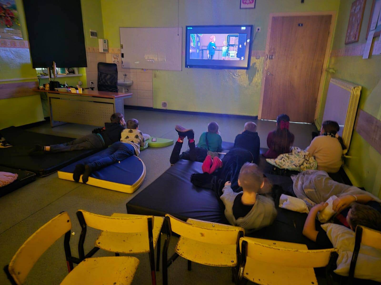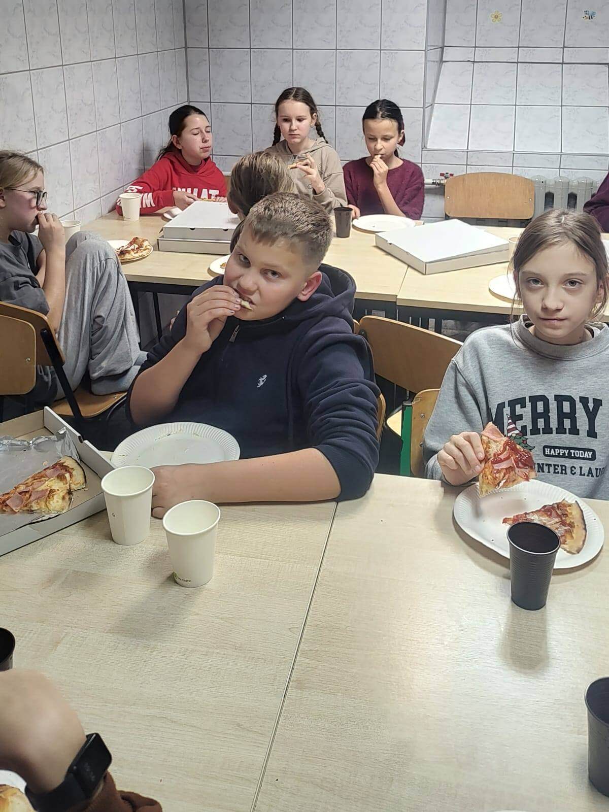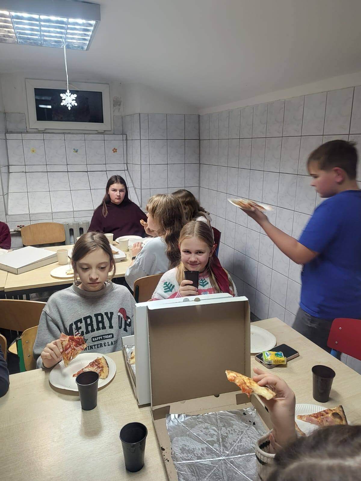 Nie zabrakło też przekąsek – dzieci zajadały popcorn, pizzę i wspólnie cieszyły się czasem spędzonym razem. Po seansach czekała na nich jeszcze druga część atrakcji – gry planszowe, które dostarczyły dużo śmiechu i dobrej zabawy.