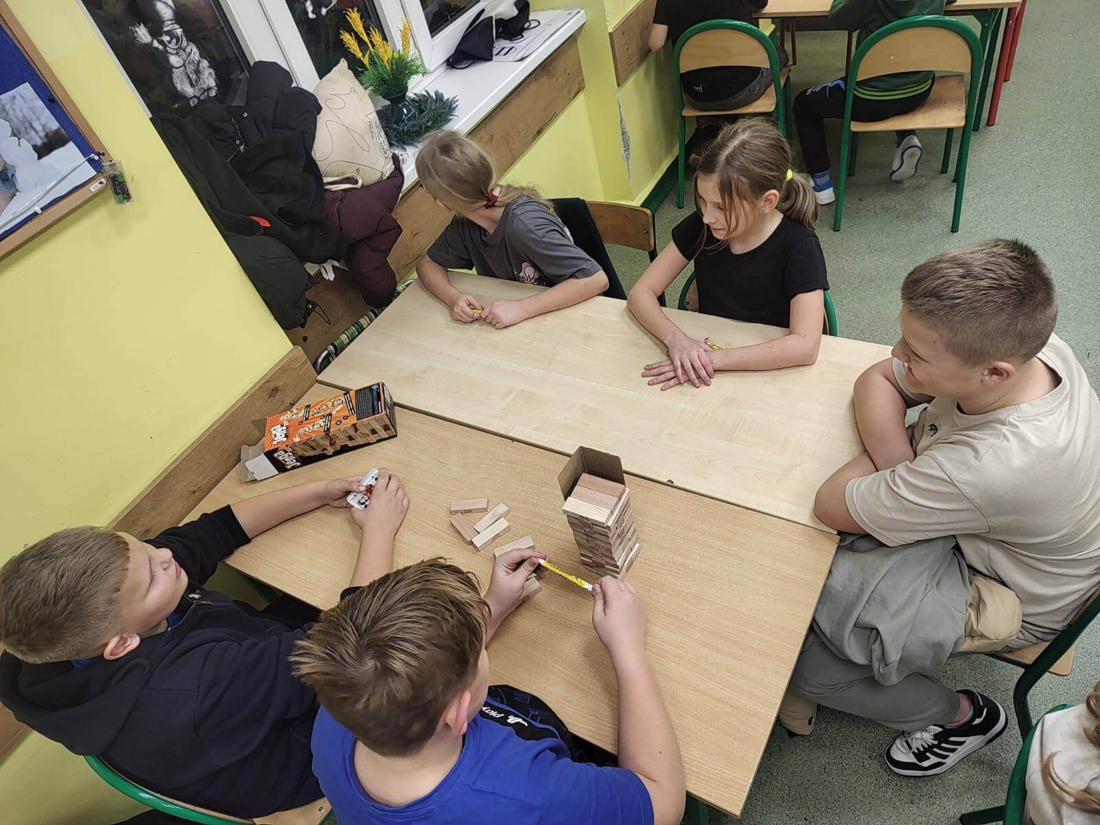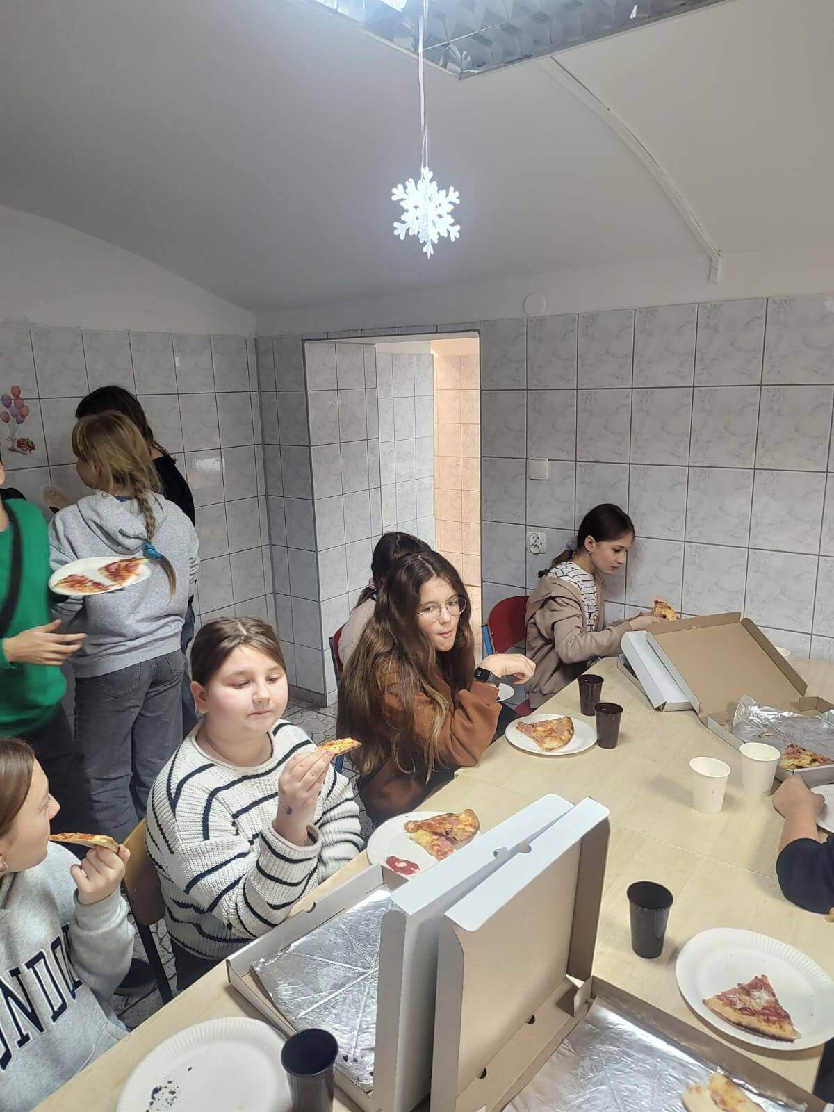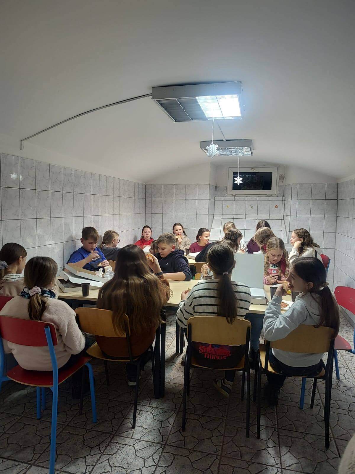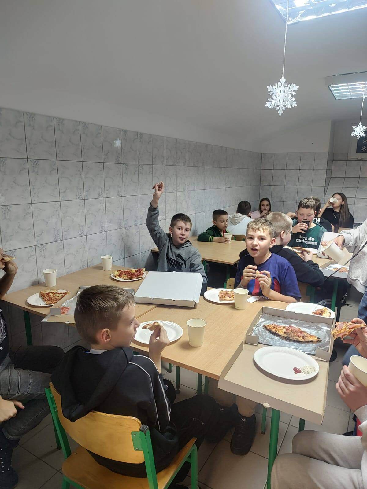 Nie zabrakło też przekąsek – dzieci zajadały popcorn, pizzę i wspólnie cieszyły się czasem spędzonym razem. Po seansach czekała na nich jeszcze druga część atrakcji – gry planszowe, które dostarczyły dużo śmiechu i dobrej zabawy.