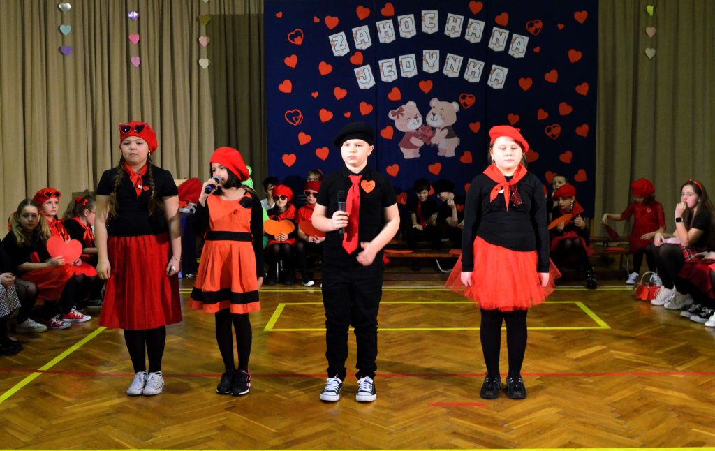 W szkole dziś czerwono było,radośnie się wszystkim żyło!Serca wszędzie, śmiech na sali,uczniowie się uśmiechali.Fotobudka przystrojona,w serca pięknie otulona –tam zdjęcia dzieci robiły,pamiątki miłe zdobyły.Samorząd kartki rozdawał,życzliwość wszystkim podawał.Róże, słodkie czekoladkii...